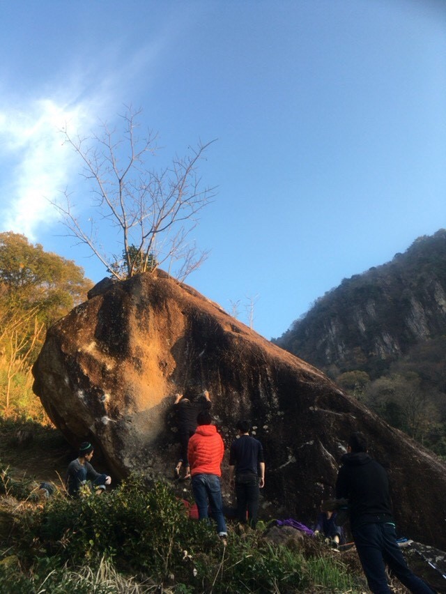 命綱を使わず低い岩(4~5m)を登る、フリークライミングの一種です。