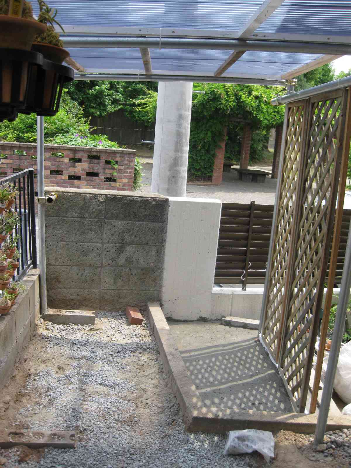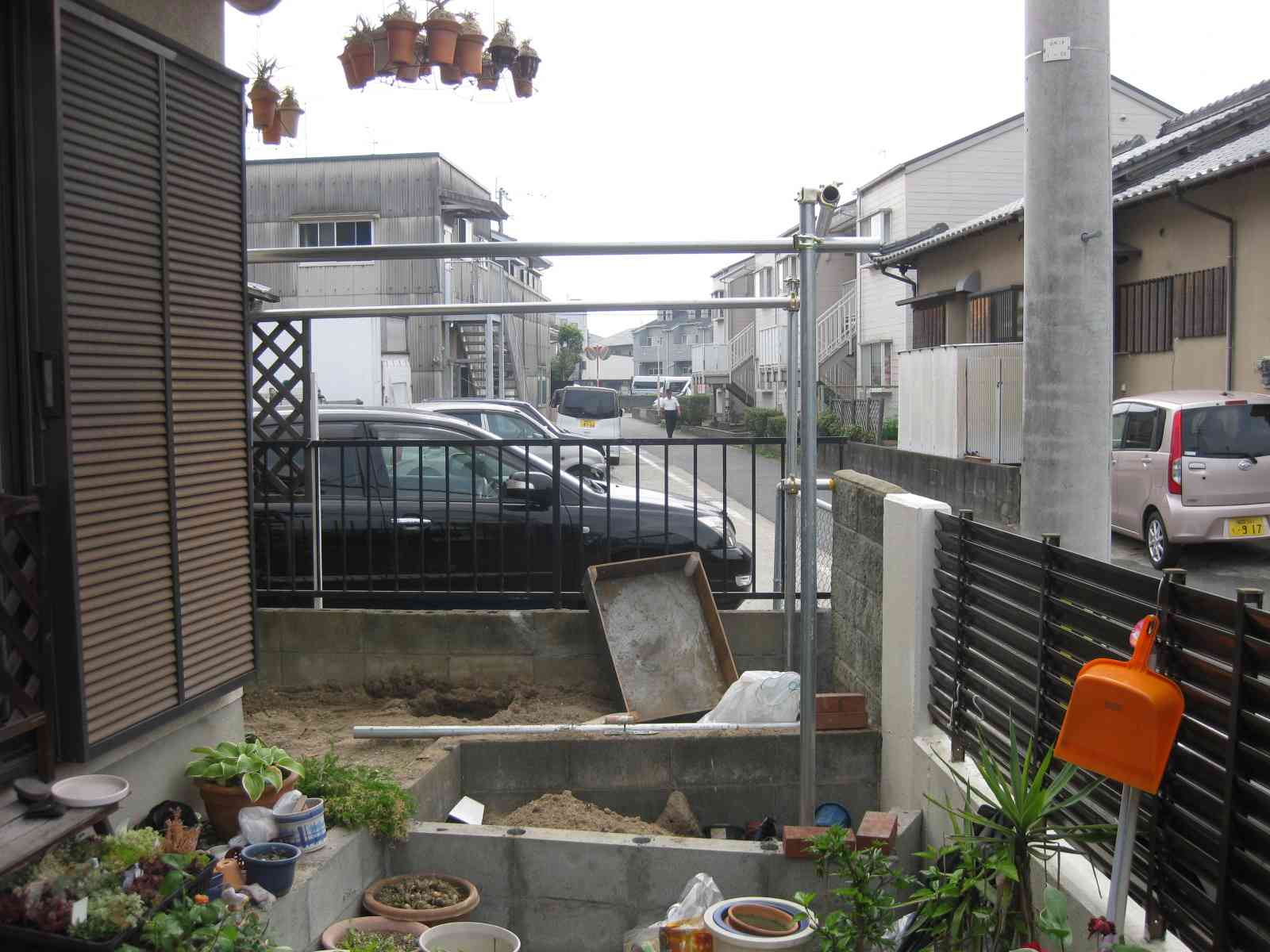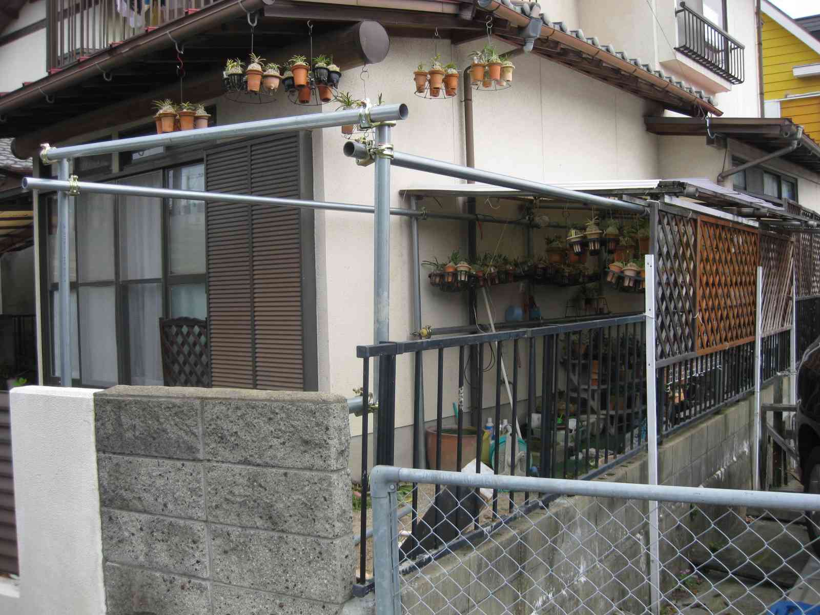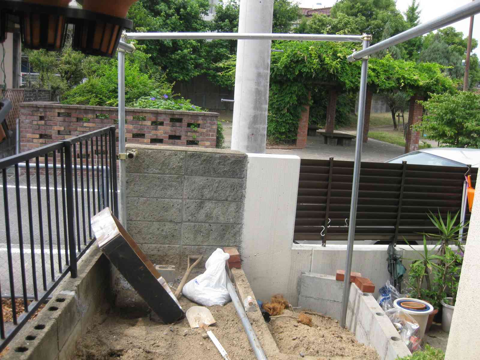 次にブロックとセメントで基礎作り、単管パイプをくんで