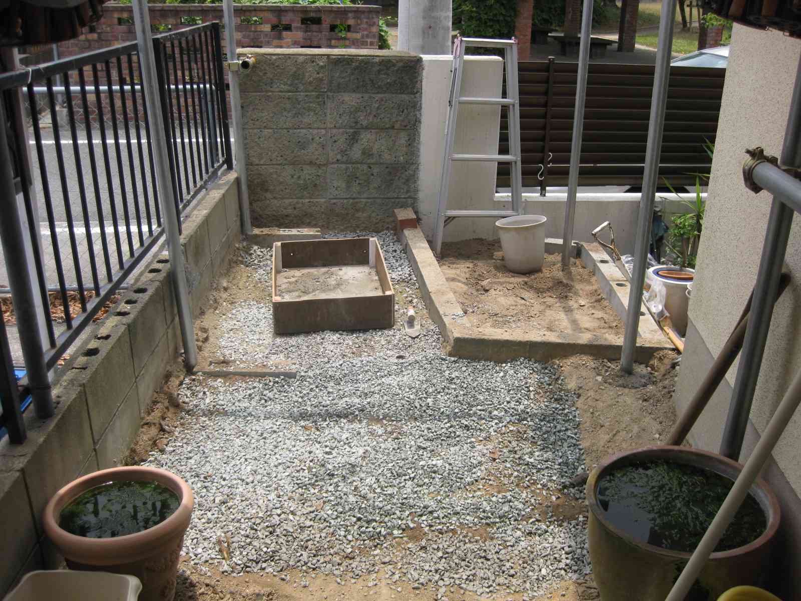 地面に砕石をまき、手前に延長した部をセメントで固定し