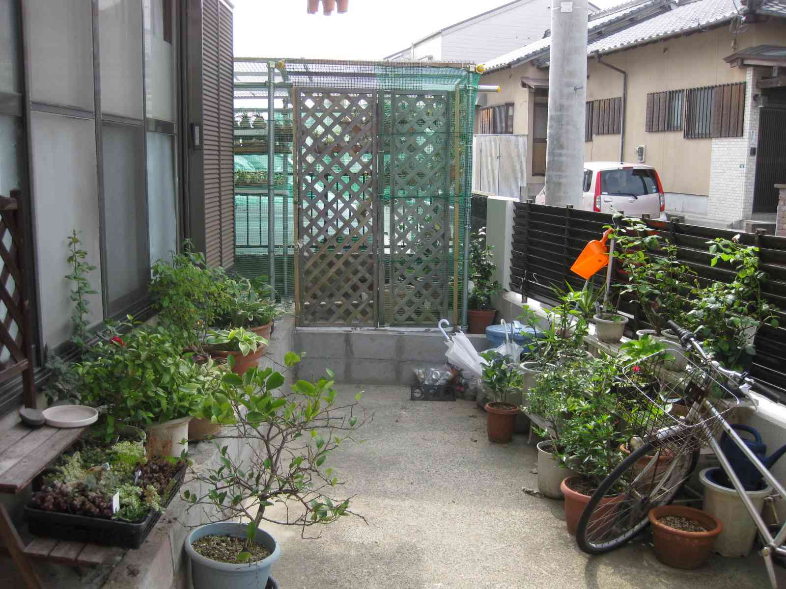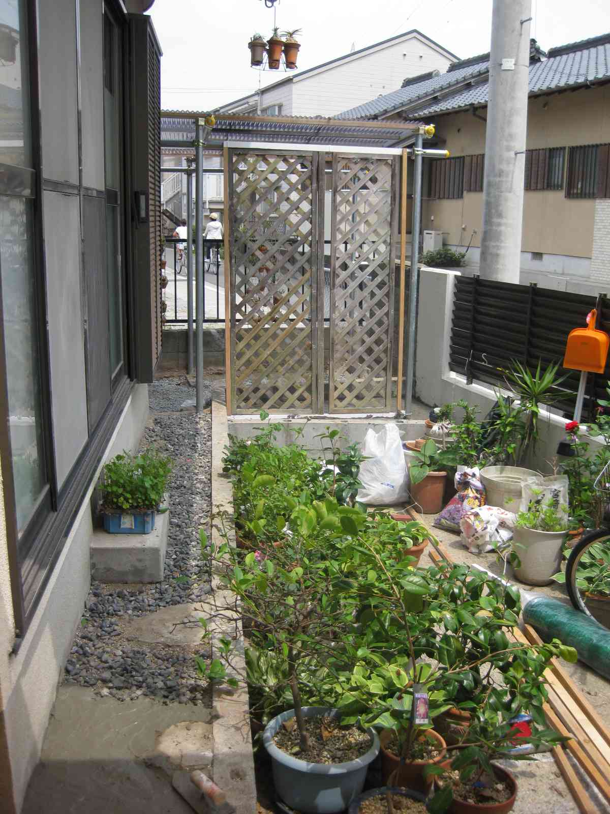 入口にラティス取り付け、周りをグリーンネットで巻いて