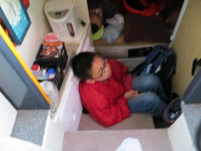 ほとんど寝ていない息子は狭い船底で爆睡中。