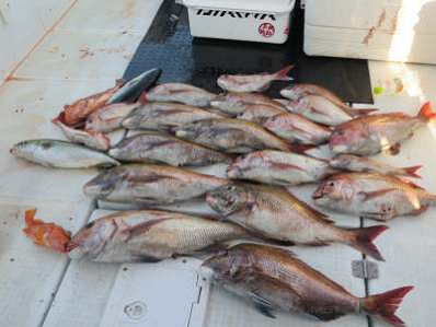 夕方4時すぎまでがんばって真鯛は息子2匹、私5匹の釣果。