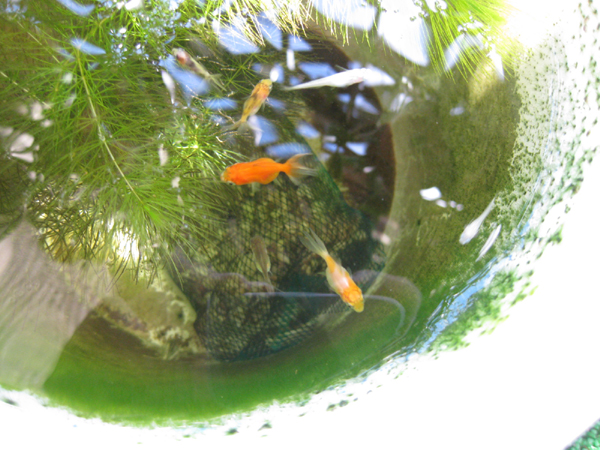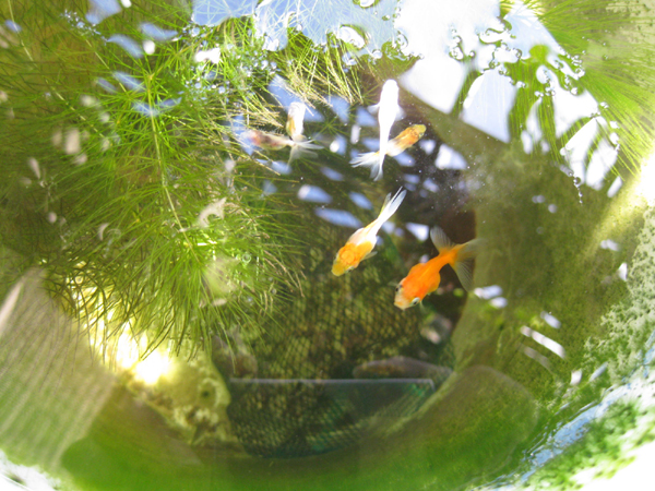 水草の茂みに隠れるかのように、小さな金魚が泳いでいました