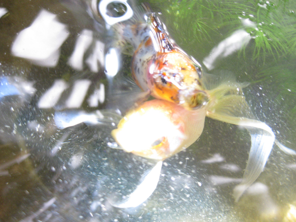 おじさんはとっさに子金魚を掬って、別の水槽に入れました。