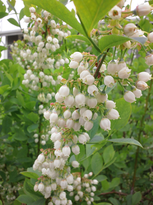 左はブルーベリーの花。この花の後にはたくさんのブルーベリーがなるんですね