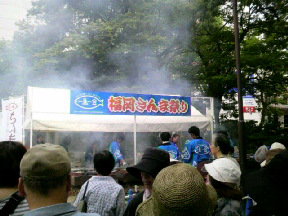 テントの中では煙の中で スタッフの皆さんが