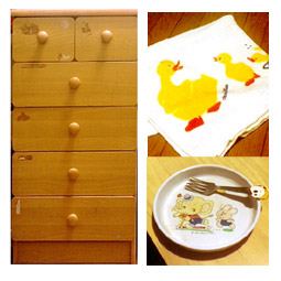 アヒルのタオルケットと離乳食用の食器は