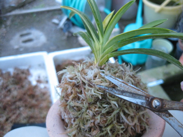 4.短いコケを春蘭鉢の底に巻いて、台座を作ります
