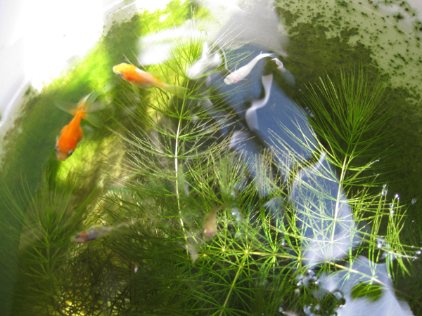 水草の茂みに隠れるかのように、小さな金魚が泳いでいました